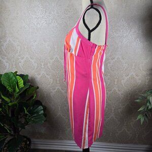 Two dresses in one! The dress has one side that is striped in pink, white and orange. Turn it inside out and you have a pink dress with a white floral pattern. Sleeveless. Keyhole at center of chest with a tie detail. Hidden back zipper. A great way to have options when packing!