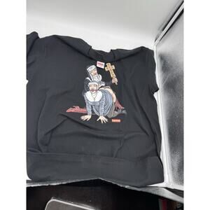The Size Medium Supreme Nuns Shirt is a stylish and edgy black t-shirt featuring the iconic Supreme brand logo. Designed for men, this regular fit t-shirt is perfect for casual wear and showcases a unique and bold design that is sure to make a statement. Made of high-quality material, this t-shirt is a must-have for fashion-forward individuals looking to add a touch of streetwear flair to their wardrobe.