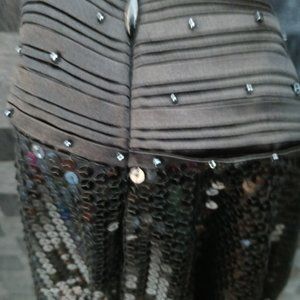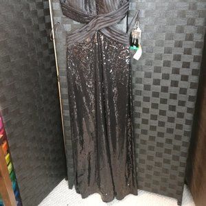 This dress is halter style with an open back and a plunging neckline, as well as cut-out sides. It's made of two distinct fabrics, a pleated and beaded satin on top and sequined on the floor-length skirt. Bought for $240, selling for $90. As-new, never used, smoke free house, needs to be steamed but is in otherwise perfect condition.