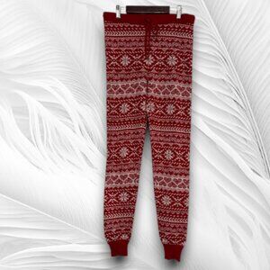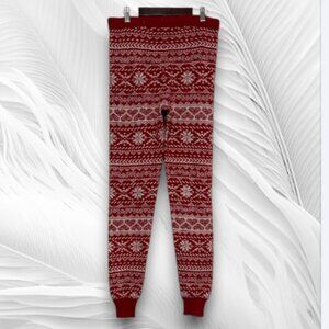 Cozy knit leggings from American Eagle, featuring a festive red and white Fair Isle design with snowflakes, hearts, and geometric stripes. Made from a soft cotton-blend knit with ribbed cuffs and a drawstring waistband for a comfortable fit. Perfect for holiday lounging, winter nights, or as a fun seasonal statement piece.