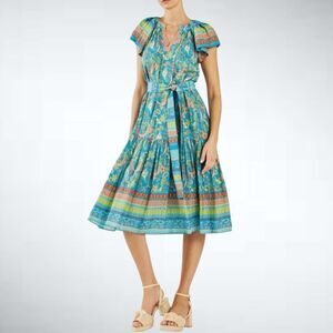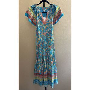 Size S Anthropologie Current Air Paisley Border Print Midi Dress in Blue/Orange