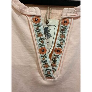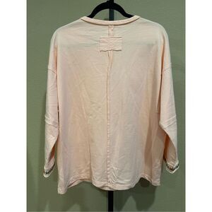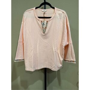 Size S (Oversized) Easel Los Angeles Notched V-Neckline 100% Cotton Terry Knit Pullover Top with Floral Embroidery in Peach