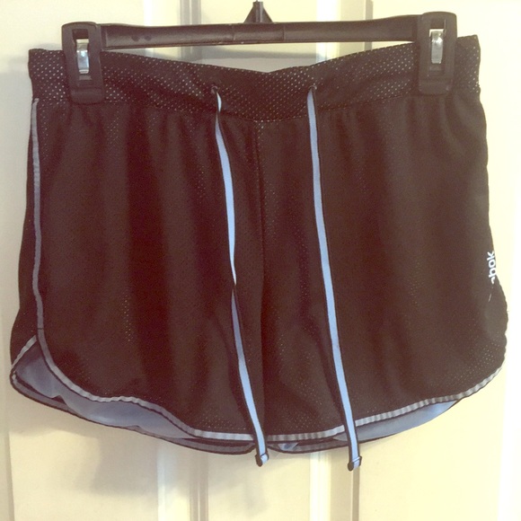 These are a light blue and black pair of athletic shorts. They have a tie waist and are breathable and super comfortable when working out
