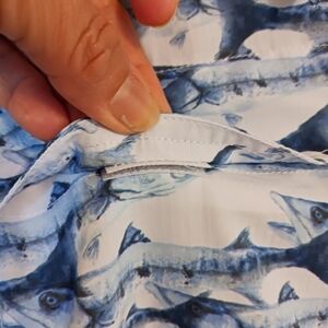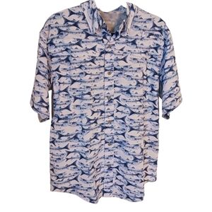 Reel Legends, Mariner II, Men's Button Down Shirt, Fishing, Casual, New without tags, Size small, barracuda fish print in blue white. Chest pockets, sunglasses/reel strap. Velcro closure on pockets and back ventilation flap.