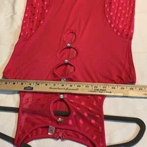 Size XL Bodycon Jumpsuit in hot pink. Stage or dance outfit with sheer sides, open front holes & very thin remainder. Like new condition & smoke free/pet free home. See ALL photos for complete description/details.
