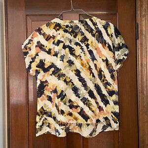 Size XL Daisy Fuentes blue yellow white blouse with ruffles. Colorful, gorgeous top in blues, whites and yellows. V-neck with ruffles around neckline and down front of blouse. The perfect work/office top or an everyday top for running errands, brunch on the weekends or more!