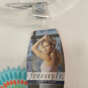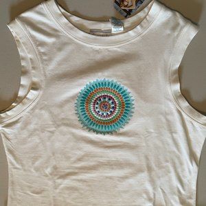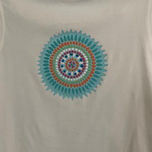 Size XL Danskin Southwest Design Sleeveless White top. 94% cotton and 6% spandex. This super soft sleeveless top is a comfort to wear. An attractive southwestern center feels like raised rubber. Stretchy tank. Machine wash. Runs small. Pits and waist 19.5". This item runs small. Will probably fit a large better. Ships same day or next.