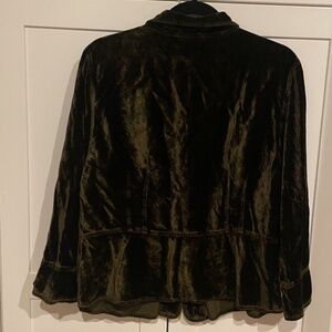 This is a beautiful, dark brown dress blazer from cut.loose. It is size XL and made of 100% rayon with a velvet look & feel. Pit to pit measurement is 21 inches and top of shoulder seam to bottom of garment is 21 inches as well