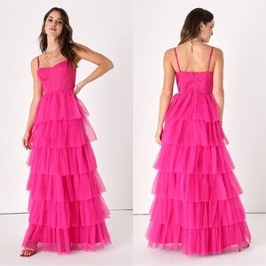 Size XL Lulus Rule the Runway Hot Pink Tulle Bustier Tiered Maxi Dress Prom Dres