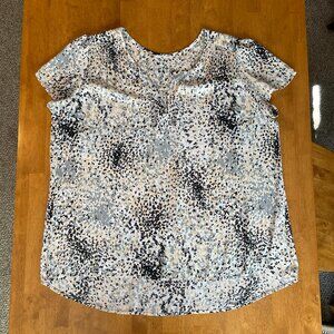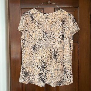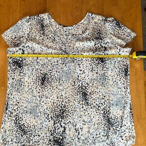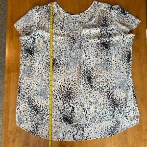 Size XL Milano black yellow white gray cap sleeve top. The perfect work/office blouse! Silky, flowy material with pleats in the back and short sleeves. Pairs nicely with pants or skirts and can be dressed up or down.