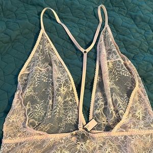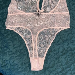 Exquisite Size XL, NWT VS baby pink plunge front racer back thong teddy- beautiful pink floral sheer lace.