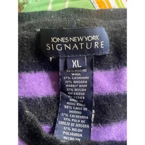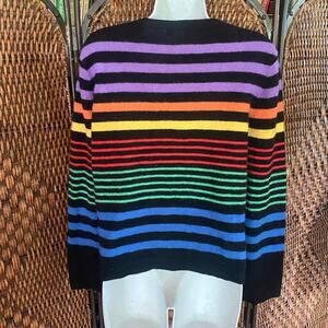 Henley style sweater. Black with rainbow stripes. Blend of merino wool, cashmere, angora, and nylon.