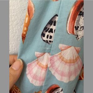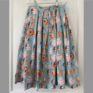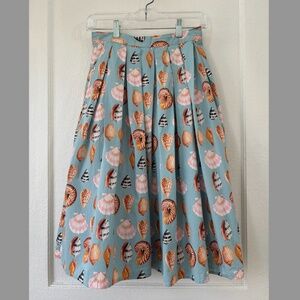 Seashell skirt by Hell Bunny. Size XS. A couple small flaws as seen in photos, small stain at waistband and thread pulling on side seam. Has pockets, back zipper closure with a button. Retro pinup girl style.