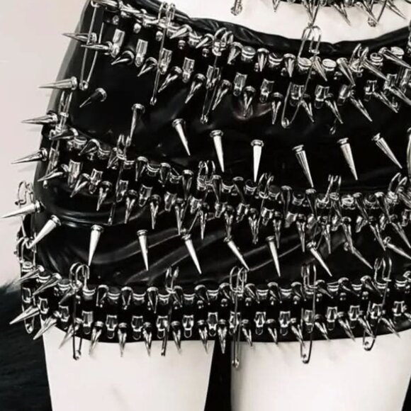 My hips are 35 inches around the widest part and I am 115 pounds. So I would make sure to be 33 or less around the booty! The material is much thicker than any outfit I have, so it does not stretch at all, it is very well made, and weights almost 3 pounds so it is very expensive to ship and was too expensive to pay for return shipping back to Canada from USA! It also has hidden shorts inside attached to it! Super cool! Please check out my listings for other matching tops that are too small for me! The spikes and bullets are only on the front part, it is plain in the back, so you can sit down!!