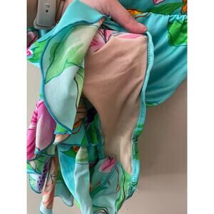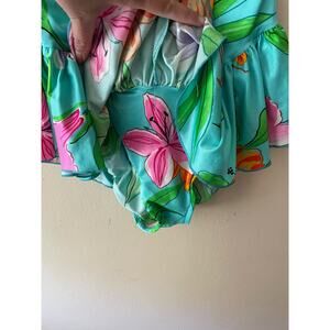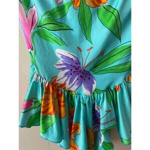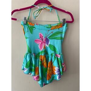 Vintage Cole of California swimsuit, size 12. Light blue with floral print pattern, peplum skirt. Strapless with halter tie at neck. Orange, pink, purple and green floral pattern.