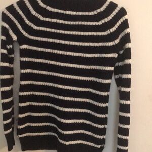 This is a X-Small blue and white striped sweater with cross detail near the arm at the top. Sweater is in good condition