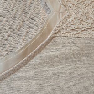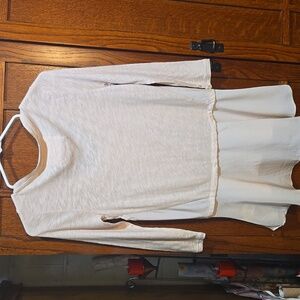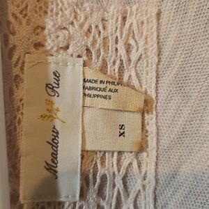 Light pink three-quarter length sleeved v-neck blouse with a silky ruffled hemline. Size xsmall by Meadow Rue. There's silky pink ribbon trim along with crocheted panels. The hemline is hi-low silky, and ruffled. Never worn.