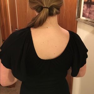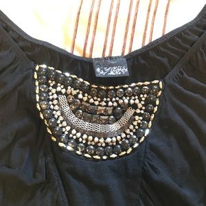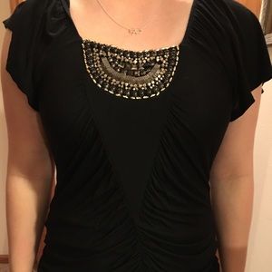 Black color, embellishing on top with material gathering in the front. Very comfortable!