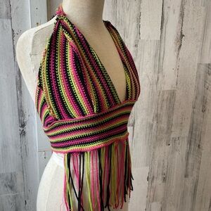 Up cycled crop top from old winter scarves! That’s right!.. scarves! Incorporated the fringe at the end of them to create this super boho aesthetic top! Accommodates a 36-38” bust and 28” waist. Top is halter design