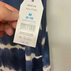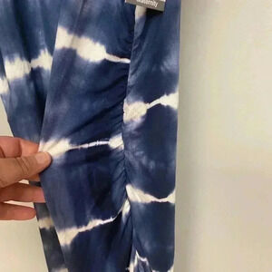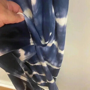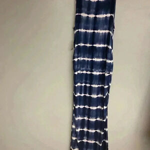Dress is 58 inches long. Size medium. Blue and white tie-dyed. There is a 14 inch slit on each side of the bottom of the dress. 20 inches pit to pit. New with tags