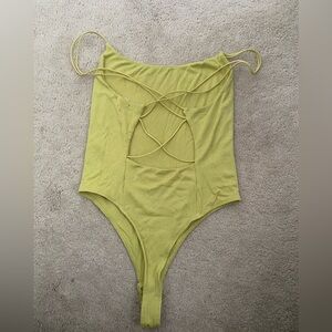 Bodysuit from garage! It has a open cross back and the color is neon yellow.