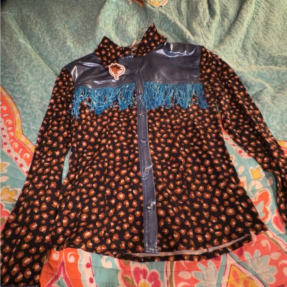 Stylish black patterned women's jacket with teal fringe trim across the chest. Features a button-up front and glossy dark blue yoke for a modern western-inspired look. Lightweight and eye-catching, it pairs well with jeans or skirts.