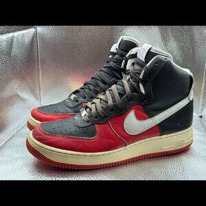 The Size 10 Nike NBA Air Force 1 Men's High Top 75th Anniversary Trail Blazers Sneaker is a stylish and comfortable athletic shoe designed for basketball and casual wear. Featuring a lace-up closure and a high-top shoe shaft style, this sneaker offers a secure fit and support. Made with leather upper material and a rubber outsole, it provides durability and traction. The shoe comes in a black and red colorway with a solid pattern, showcasing a blend of athleisure and sports themes. Perfect for all seasons, this Nike Air Force 1 model is a great addition to any man's shoe collection.
