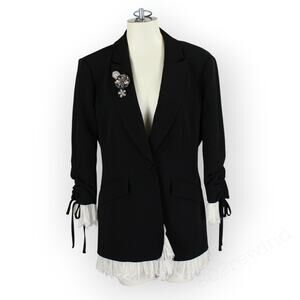 Wrap yourself in sophistication with our breathtaking Roxie Blazer, featuring luxurious cascading crepe fabric, elegant ruffled hems, and exquisite sleeve details adorned with delicate embellishments on the lapel.