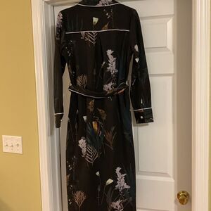 Floral print lightweight/summer weight double breasted overcoat w/ lapel collar and belt loops w/ sash tie waist. Unlined.