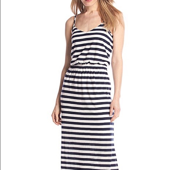 💙Featured in navy and white; Scoop Neck; Spaghetti strap; Pullover design; Open knit; Stripe pattern; Cinched waist band; Maxi length; Machine Wash; Polyester / rayon / cotton💙