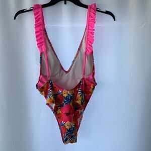 Size small pink, blue, red, yellow and white ruffle one piece swimsuit. Ruffled straps