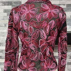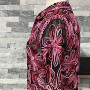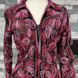 This a very cute and unique vintage jacket, zippered front. A bit small for me but it's adorable. Black with pretty pink tones of ribbon sewn into the design of the jacket.