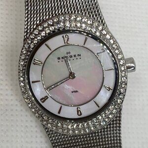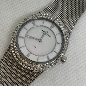 Skagen 566XSSS Ultra Thin women watch all stainless steel Crystal Bezel Water Resistant Quartz 26mm adjustable mesh bracelet size up to 8”, in good condition battery installed