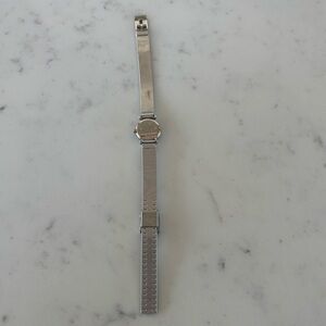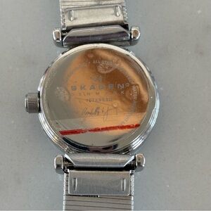 Signature on the back, dainty, adjustable band, will need a new battery.