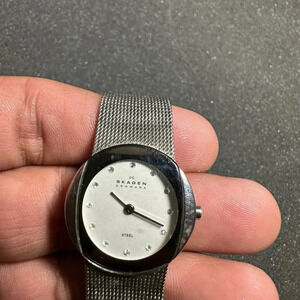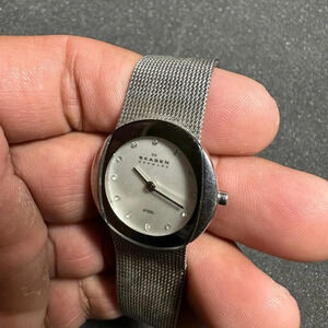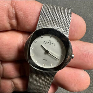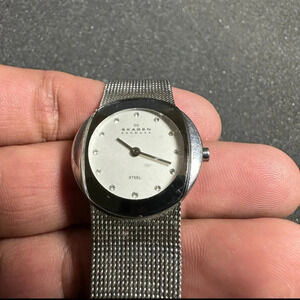Skagen Denmark Steel Ladies Quartz Watch Silvertone White Diamond Dial Working shows signs of wear such as scratches on case band and crystal see pictures for reference
