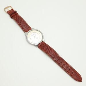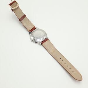 Pre-owned but in great condition! One main flaw is that the hour 1 indicator came loose and is not stuck over near the 9 hour marker. It is very stuck, and I cannot dislodge it (despite aggressively trying), so it is unlikely to come loose, and is mostly usually only noticeable when up close. The band is a replacement brown lizard leather strap in good condition with light wear. PLEASE see picture #4 for the measurement to confirm it is a good size for you. The crystal is also in good condition, please see all pictures for details on any scratches if there are any. The watch is currently running smooth and keeping accurate time. Battery was replaced (9/29/25), and we will check the watch before shipping to ensure it is working!