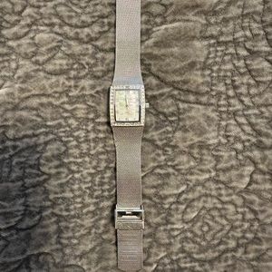 Skagen watch from Denmark. Beautiful mother of pearl face with crystals. Silver mesh band which is adjustable. A beautiful time piece.