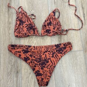Stylish animal print bikini set in orange and black. Perfect for the beach or pool. Large top, Medium bottoms.
