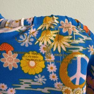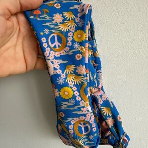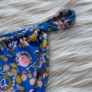 The Bobbi Bottom by Skatie in Humboldt (blue with mulitcolor groovy, retro peace signs, flowers, moon, love). Say hello to Bobbi, the perfect string bottom that guarantees zero pinching. The slider detail on the string waistband coupled with a ruched silhouette makes Bobbi completely adjustable for your best fit. More coverage or less, high leg or mid rise, you get to decide! Gently worn with no flaws.