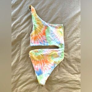 Vibrant tie-dye one shoulder swimsuit. Features a unique asymmetrical design. Perfect for a bold beach look.