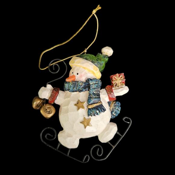 Festive “Skating Snowman with Bells” Christmas ornament.