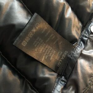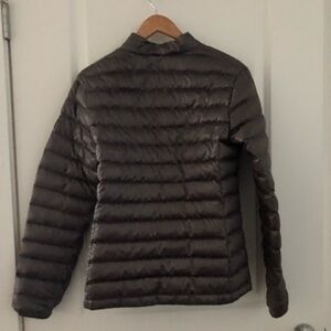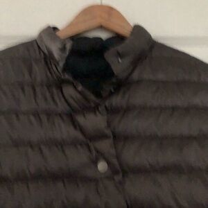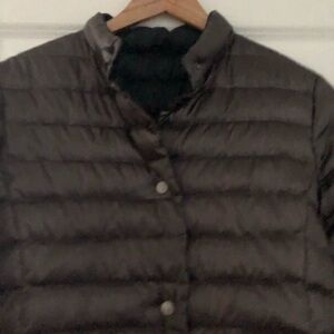 Snap front. Metallic. Filling: 80% Goose Down/20% Waterfowl Feathers. EUC. Front pockets. Missing size tag but fits like an Extra Small.