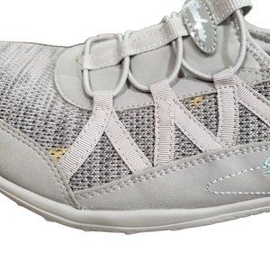 Skechers Be Lite Possibilities light gray sneakers women size 9.5 are still in the original box. Gently worn, overall good condition, freshly washed and ready for you to wear. Two very small 1/4" yellow stains on one shoe, on mark on left heel, and slight wear on soles near heel (last 3 photos). Please study all photos as part of the description. Low price is based on condition – NO FURTHER DISCOUNTS. Box included unless you don’t want it.