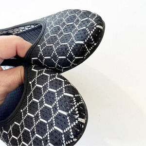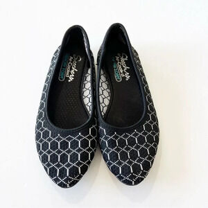 Skechers flyknit pointed toe flats size 7. Black and white geometric print. Preowned, light wear. Runs 1/2 size big.