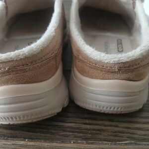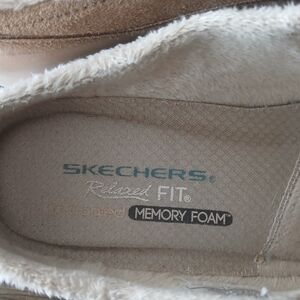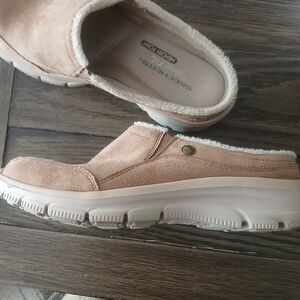Skechers Relaxed Fit: Easy Going-Latte suede-textured clogs. These slip-in shoes feature a soft, microfiber fabric upper with plush faux fur trim, offering instant warmth and comfort. The Skechers Air-Cooled Memory Foam insole molds to your feet, providing cushioned support and breathable comfort. The lightweight, shock-absorbing midsole and flexible rubber traction outsole responsive cushioning and sure footing. Designed with 3M Scotchgard and Bio-Dri technologies, these water-resistant clogs help repel moisture and keep your feet dry. Part of the Skechers Modern Comfort line, the Easy Going clogs blend style and all-day