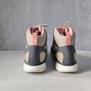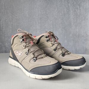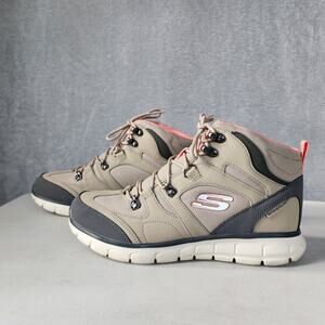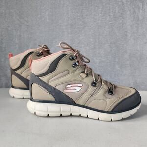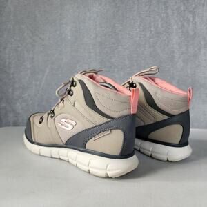 Sleek Skechers ankle boots. Beige body with charcoal details. Lightweight and supportive.