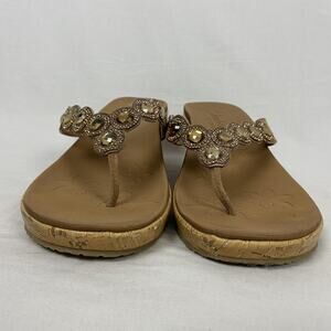 Brown/tan upper with gold-tone rhinestone embellishments and natural cork-look midsole.