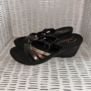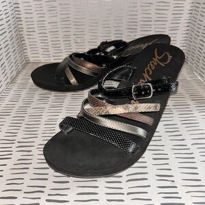 Skechers Black Brown Snake Strappy Sandal Wedge Slide Cali Rambler Women's 10
