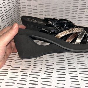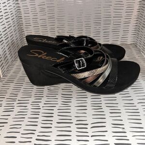 Skechers Black Brown Snake Strappy Sandal Wedge Slide Cali Rambler Womens 10