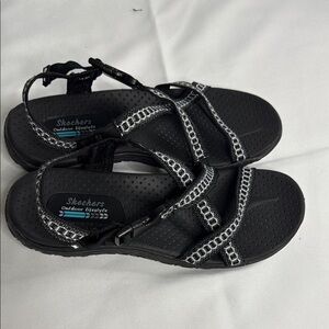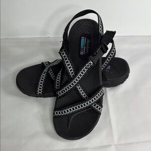 Step into style with these Skechers black sandals, featuring crisscross straps adorned with white detailing. The flat sole and adjustable ankle strap provide a comfortable and secure fit, perfect for casual summer outings.